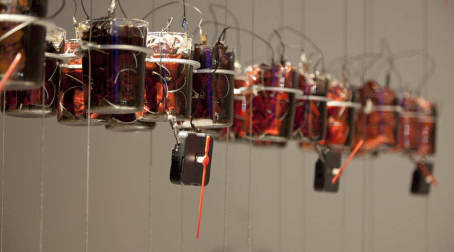 Instalacija Nespresso-baterija prikazuje energiju sadržanu u Nespresso kapsulama. Energija se očituje u pomicanju kazaljki sata, ukazujući na važnost sakupljanja i recikliranja vrijednog materijala poput aluminija, propitujući njegovu upotrebu uopće.