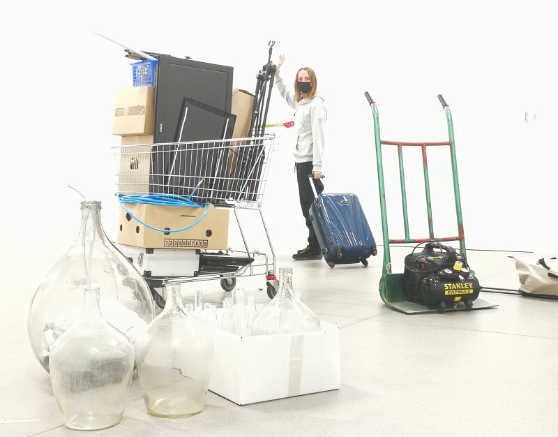 “B E L L O W S” is an exploration of the mediality of air, the openness of respiratory bodies towards the atmosphere and breathing of all living and non-living beings/things. The fascination with air and the atmosphere stems from the notion that – immersed in air from the start of our existence, with lungs as the first organ after birth faced with the perception of space – we neglect the initial fact that, as a respiratory body, we form part of the atmosphere. In the first instance, breathing is not a relationship with objects but with the atmosphere, while skin is a fragile membrane that separates two spaces filled with air, the outside and the inside. A system of respiratory bodies/windbags and the activity of breathing may be perceived as the rhythm of paying of what we owe in oxygen in the constant economic game of the inflation of the body.