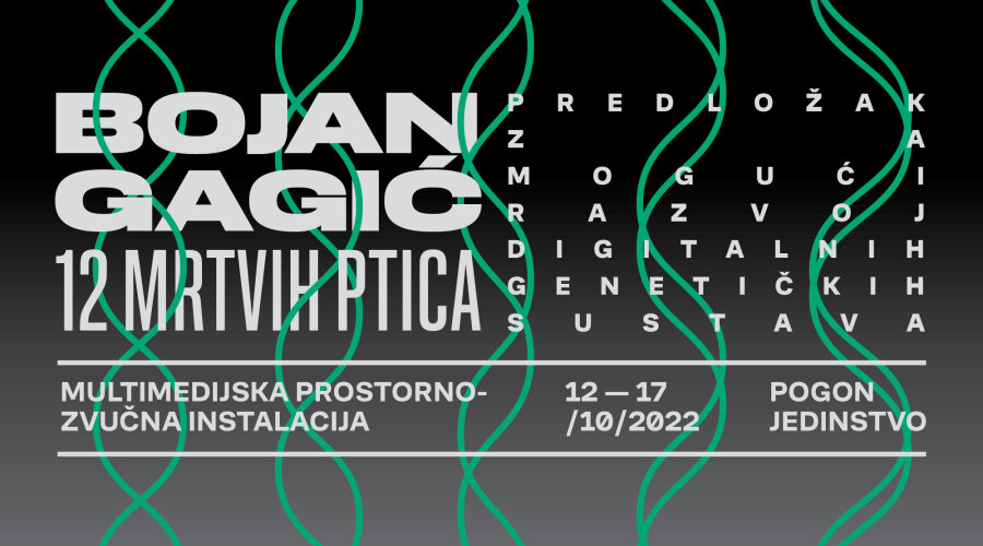 Multimedijska prostorno-zvučna instalacija "12 mrtvih ptica - predložak za mogući razvoj digitalnih genetičkih sustava" Bojana Gagića (HR) u produkciji udruge KONTEJNER i Greta Creative Network-a otvara se u Pogonu Jedinstvo u Zagrebu, u srijedu 12.10.2022. u 19h. Izložba će biti otvorena od 13. do 17. listopada od 16:00 do 20:00 h.