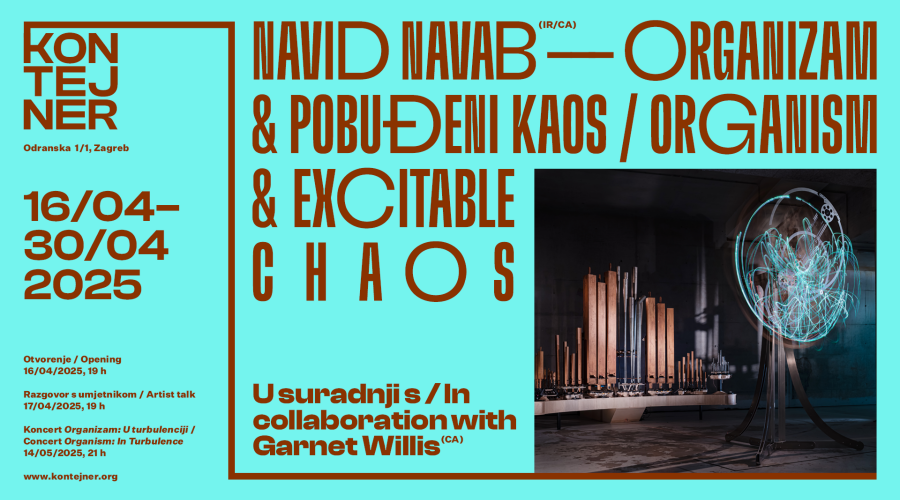 U srijeda, 16. travnja 2025., u 19 sati, u KONTEJNER-u se otvara izložba najnovijih radova kanadskog umjetnika Navida Navaba koji je u suradnji s Garnetom Willisom pristupio istraživanju koje isprepliće tehnološke tendencije te prirodne i ljudske elemente, s kaosom u središtu njihovih eksperimenata.