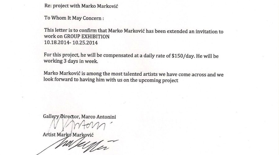 Prilikom izrade vize u sklopu tražene prijavne dokumentacije Marković izrađuje i sklapa ugovore s ugovorenim stranama, muzejima i galerijama s kojima prikazuje trogodišnji plan aktivnosti u kulturno-umjetničkim domenama rada. Među ugovorenim stranama predstavio je ugovore s institucijama: MoMA, ISCP, Residency Unlimited, CEC Arts Link, NURTUREart. Kentler International Drawing Space itd.