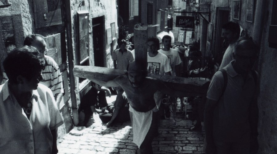 Budući da je raspelo vjekovni simbol ljudske patnje sveprisutan od Rimskog Carstva (tada je razapinjanje bio jedan od načina mučenja i egzekucije) i osnutka kršćanstva sve do danas, izabran je križ i čovjek na križu kao okosnica poruke performansa. Taj prizor je u kazalištima, vjerskim blagdanima (Uskrs), performansima, filmovima i uopće u likovnoj umjetnosti često korišten i ne izaziva sablazan niti u zemljama gdje je kršćanstvo ukorijenjeno u svim porama društva.