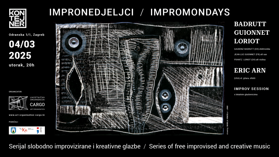Koncert se održava u utorak, 4. ožujka 2025. u 20h, a nastupit će trio Badrutt – Guionnet – Loriot koji čine elektroničar Gaudenz Badrutt (CH), saksofonist Jean-Luc Guionnet (FR) i violist Frantz Loriot (FR/JP). Zatim slijedi solo nastup gitarista Erica Arna (Premordial Undermind) (US), a u zajedničkom impro sessionu na kraju priključit će im se i glazbenici zagrebačke improvizatorske scene.